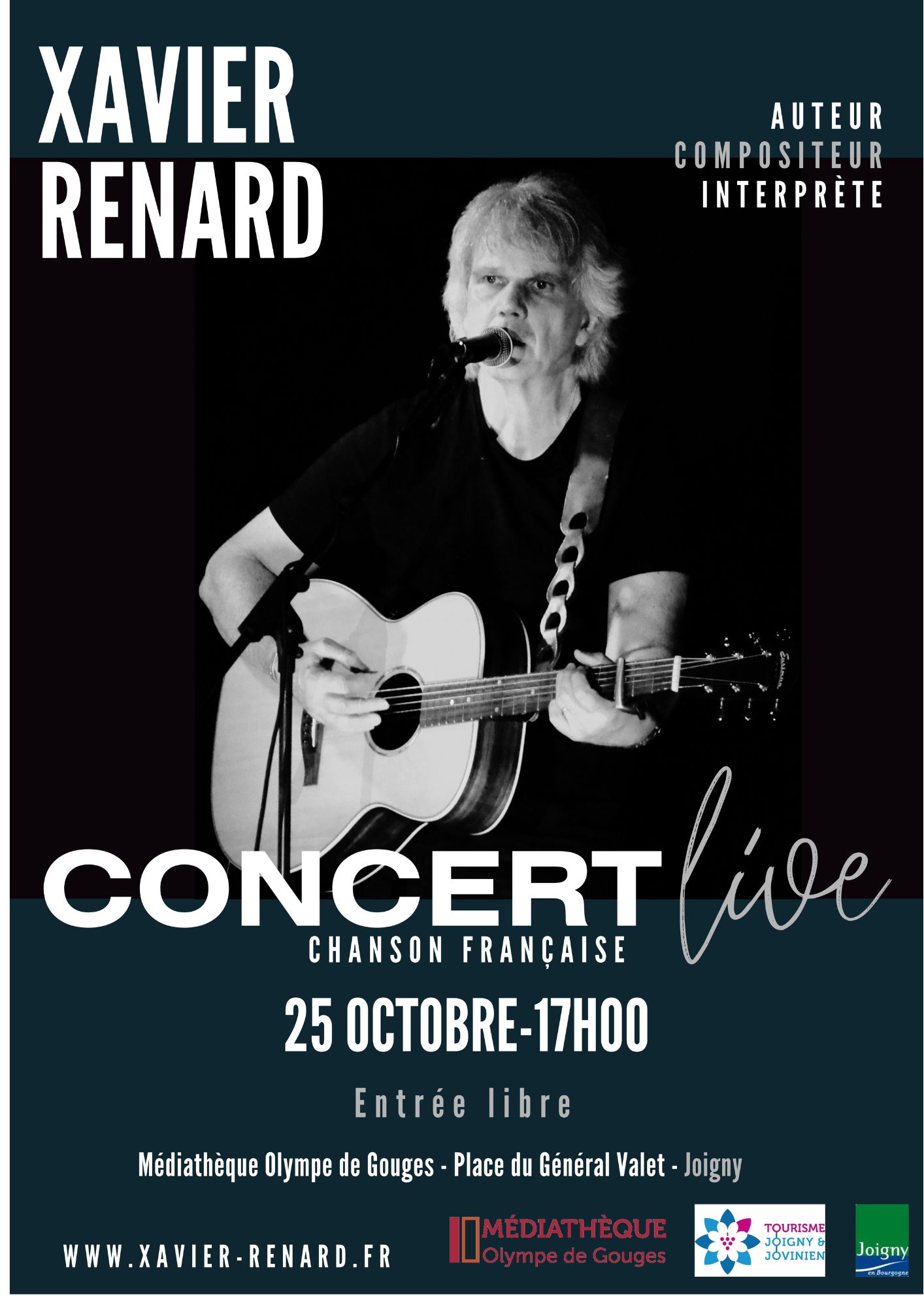 La médiathèque Olympe de Gouges accueille l'artiste Xavier Renard, auteur, compositeur et interprète pour un concert de chansons françaises.
