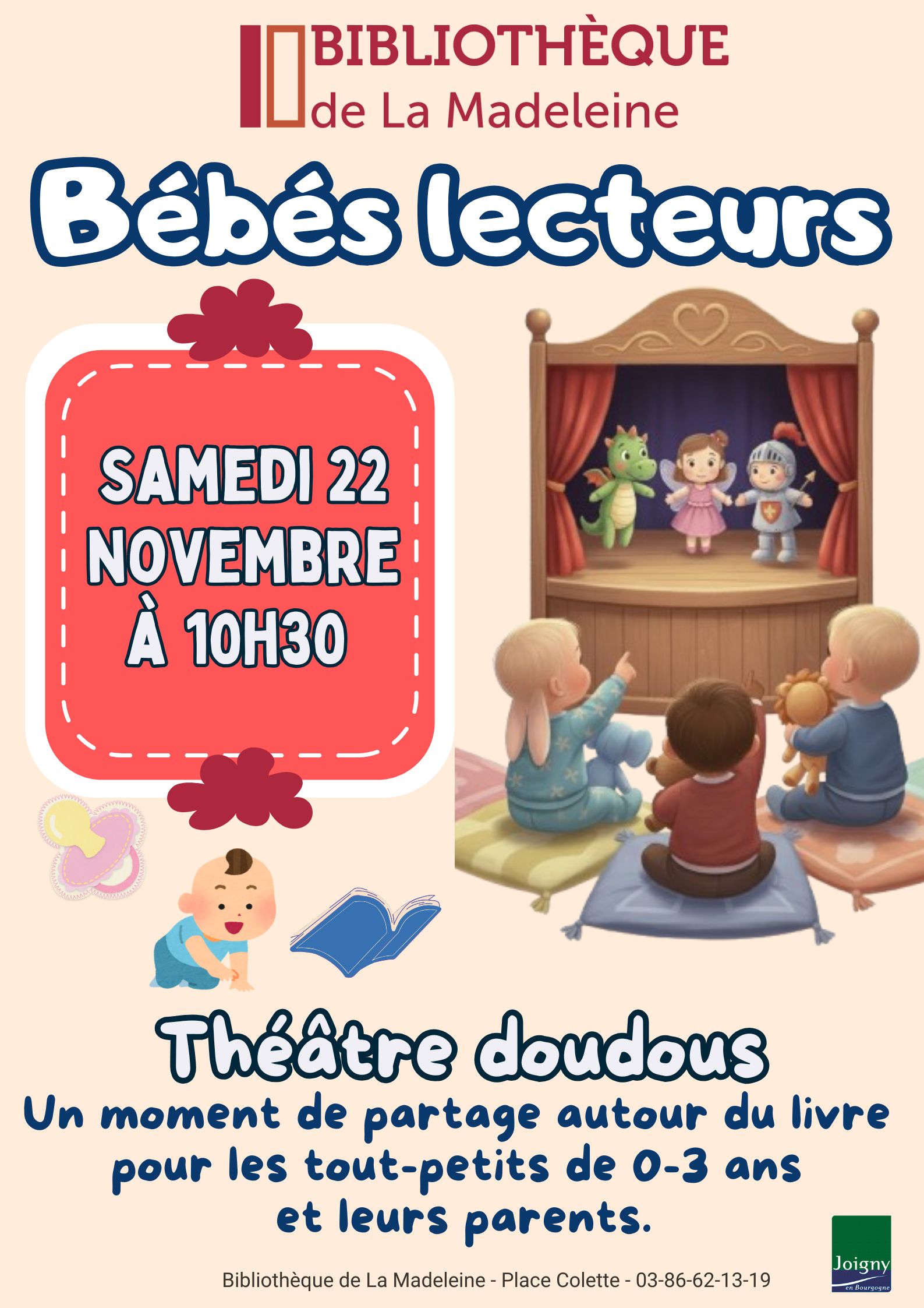 Bébés lecteurs Un moment de lecture pour les 0-3 ans et leurs parents. Catégorie Contes Détails des prochaines sessions Le samedi 22 novembre 2025 à 10:30 Ical Public Tout-petits Lieu Bibliothèque de La Madeleine